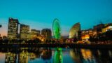 夕暮れの横浜みなとみらいと観覧車のライトアップ