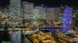 夕暮れ時の横浜みなとみらいと観覧車と遊覧船