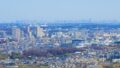 掃部山公園から眺める横浜みなとみらいの高層ビルと秋の風景
